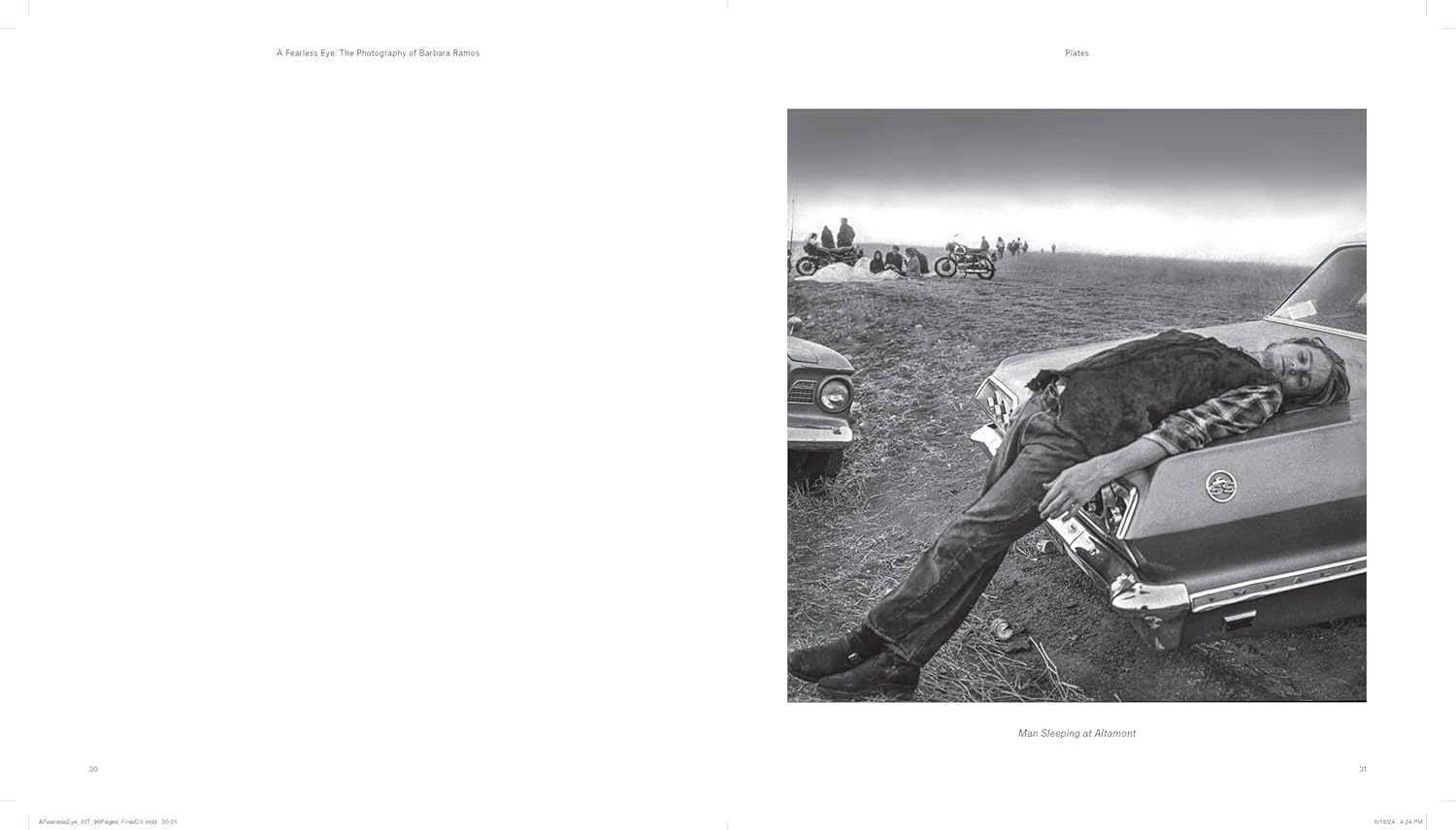 Déterrées cinquante ans après leur prise de vue, les photographies de Ramos offrent des scènes émouvantes de la vie quotidienne : un groupe de Hari Krishnas chante sur Market Street, une éta-lagiste change un mannequin à Union Square Macy’s, deux hommes se penchent pour s’embras-ser lors d’un rassemblement pour la paix dans le parc du Golden Gate. A Fearless Eye présente pour la première fois les images de Ramos sur papier et fait découvrir au public un photographe dont le travail s’inscrit dans la lignée de ceux de Robert Frank, Diane Arbus et Vivian Maier.