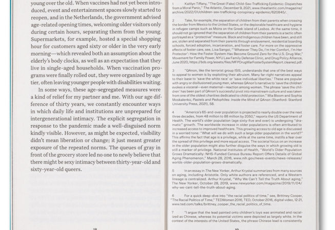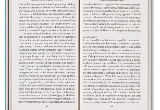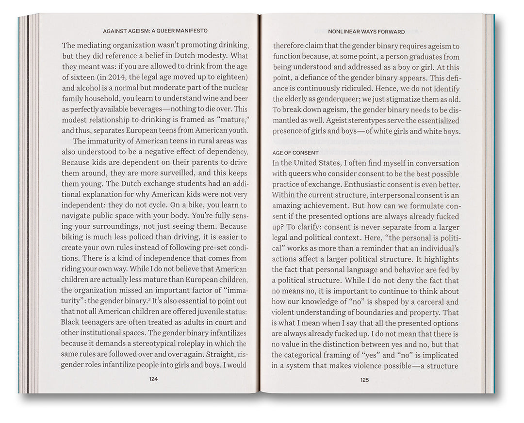 S’inspirant de son expérience personnelle, le manifeste propose une réflexion sur la manière dont l’âgisme se superpose aux structures de la suprématie blanche et du patriarcat. À travers le prisme des théories crip et queer, ainsi que des perspectives anti-carcérales et anti-coloniales sur le temps, ce texte percutant appelle de manière provocante à l’abolition des lois relatives à l’âge, recadrant les conceptions communément admises sur l’âge à partir de la perspective provocante de van Saarloos.