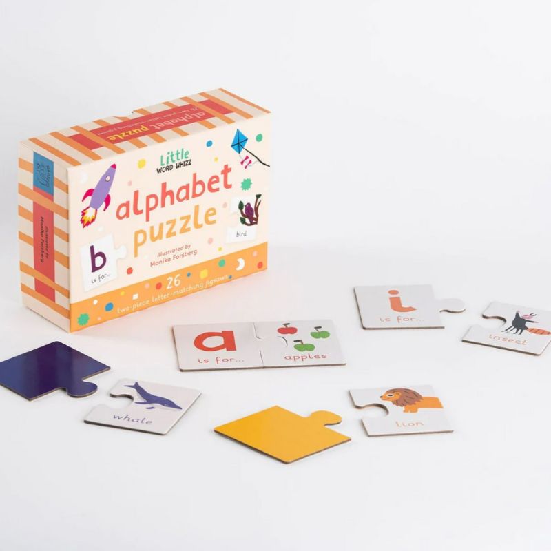 Ce coffret contient 26 puzzles individuels pour encourager la reconnaissance des lettres et des sons en anglais. Chaque puzzle de deux pièces comporte une image à associer à chaque lettre de A à Z, ce qui favorise le développement du langage et de la lecture.