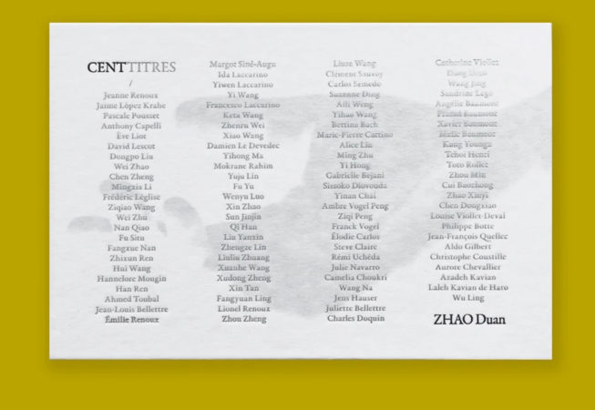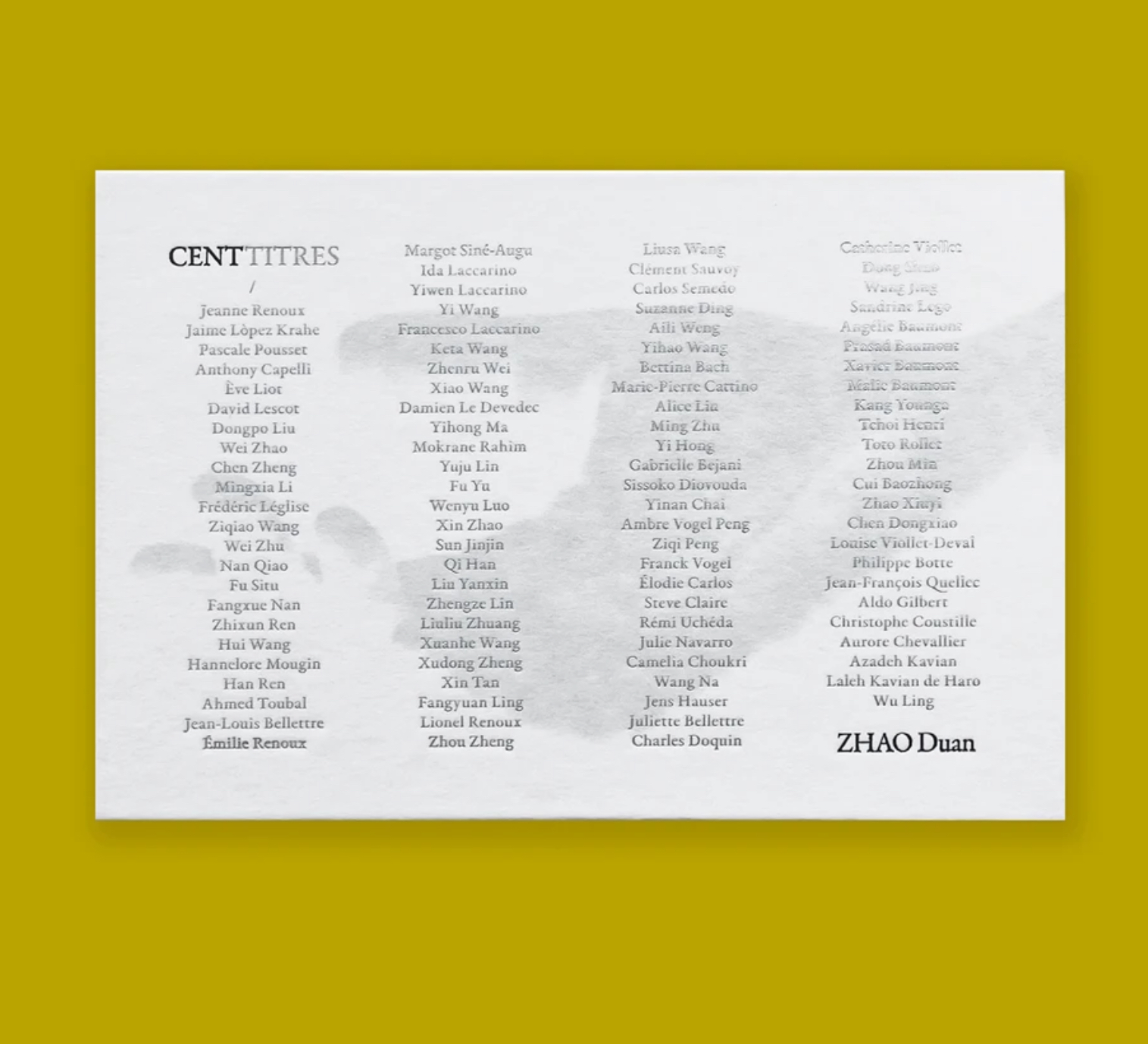 Les Cent Titres ont été réalisés entre février et avril 2021, pendant la période de prévention et de contrôle des épidémies où l’éloignement physique était encore obligatoire en France. L’artiste a invité 99 personnes dans son atelier, l’une après l’autre, le dernier participant étant Duan elle-même. Ils se sont assis face à face, tandis que Duan leur tenait la main et dessinait leur portrait sur leur paume. Ensuite, elle a demandé aux participants de presser leurs mains sur du plexiglas, en laissant l’empreinte de leurs portraits.