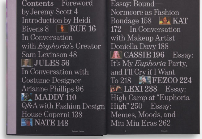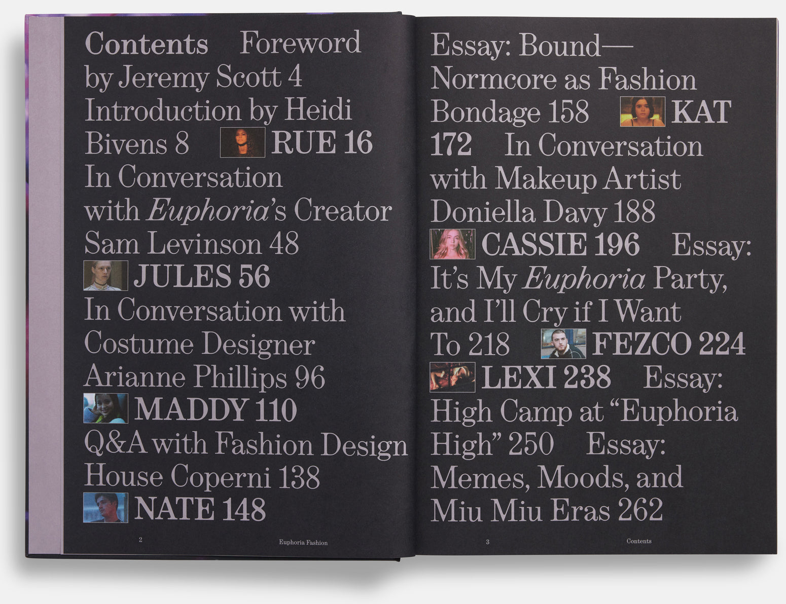Cet ouvrage comprend une introduction de Jeremy Scott, des questions-réponses exclusives avec des maisons de couture et des designers de renommée mondiale comme Coperni et Arianne Phillips, ainsi que des essais originaux de William Van Meter, Mitchell Kuga, José Criales-Unzueta et Biz Sherbert sur le high-camp, le bondage norm-core, les humeurs et les mèmes tirés d’Euphoria Twitter.