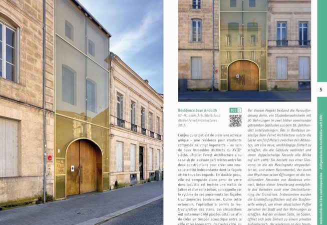 Ce guide bilingue (français / allemand), qui compile près de 130 édifices, est l’occasion de découvrir l’actualité récente de la cité girondine, mais aussi son patrimoine.