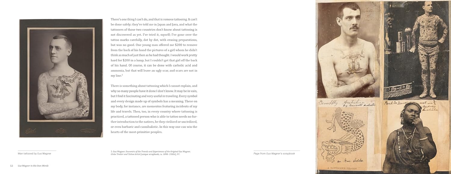 En 1897, Gus s’est lancé dans une carrière de quatre ans en tant que marin marchand. En voyageant à travers le monde, il découvre l’art du tatouage, apprenant à tatouer auprès de tribus de Java et de Bornéo qui lui montrent comment utiliser les outils traditionnels fabriqués à la main. En 1901, Gus aurait réalisé 264 tatouages (et plus de 800 en 1908), ce qui lui permet de se présenter comme “l’homme le plus artistiquement marqué d’Amérique”.