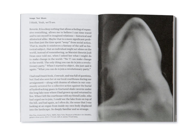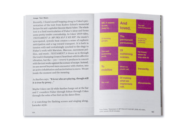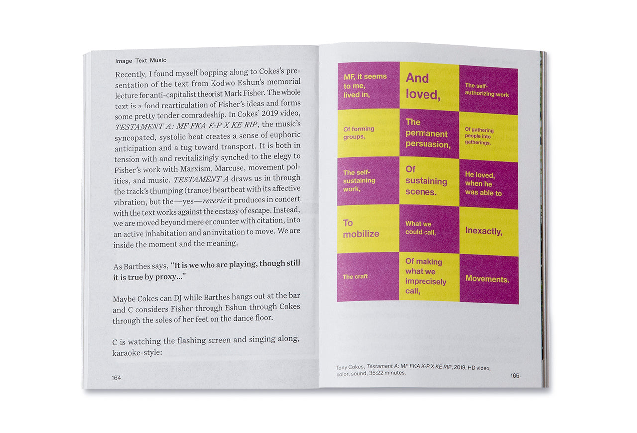 Dans Image Text Music, l’écrivaine et éditrice Catherine Taylor explore le point de rencontre entre le visuel et le verbal. Elle s’inspire de l’essai classique de Roland Barthes de 1977, Image Music Text, qu’elle subvertit en utilisant son titre comme point de départ ludique de sa réflexion sur la nature des œuvres image-texte et sur la musique qui pourrait être faite à leur intersection.