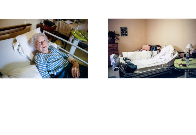 Cinq procédés photographiques, tous argentiques, se suivent pour rendre compte de l’évolution de leurs maladies. La matière se dégrade comme leurs cerveaux dysfonctionnent. Les images deviennent moins lisibles comme leurs perceptions de la réalité s’altèrent. L’émotion de leur disparition et le processus neurologique en cours sont transmis dans un même geste. En premier lieu, le grand-père de l’auteur est pris en photo dans unnoir et blanc charbonneux. Il est en EHPAD et bloqué dans le passé. Sa grand-mère essaie de le retenir de la chute dans des abymes de noirs profonds. Dans le même temps, Yann Castanier photographie sa grand-mère chez elle, seule, et les traces de son grand-père dans leur maison avec despellicules couleurs non-altérées. La colorimétrie est franche et fidèle.