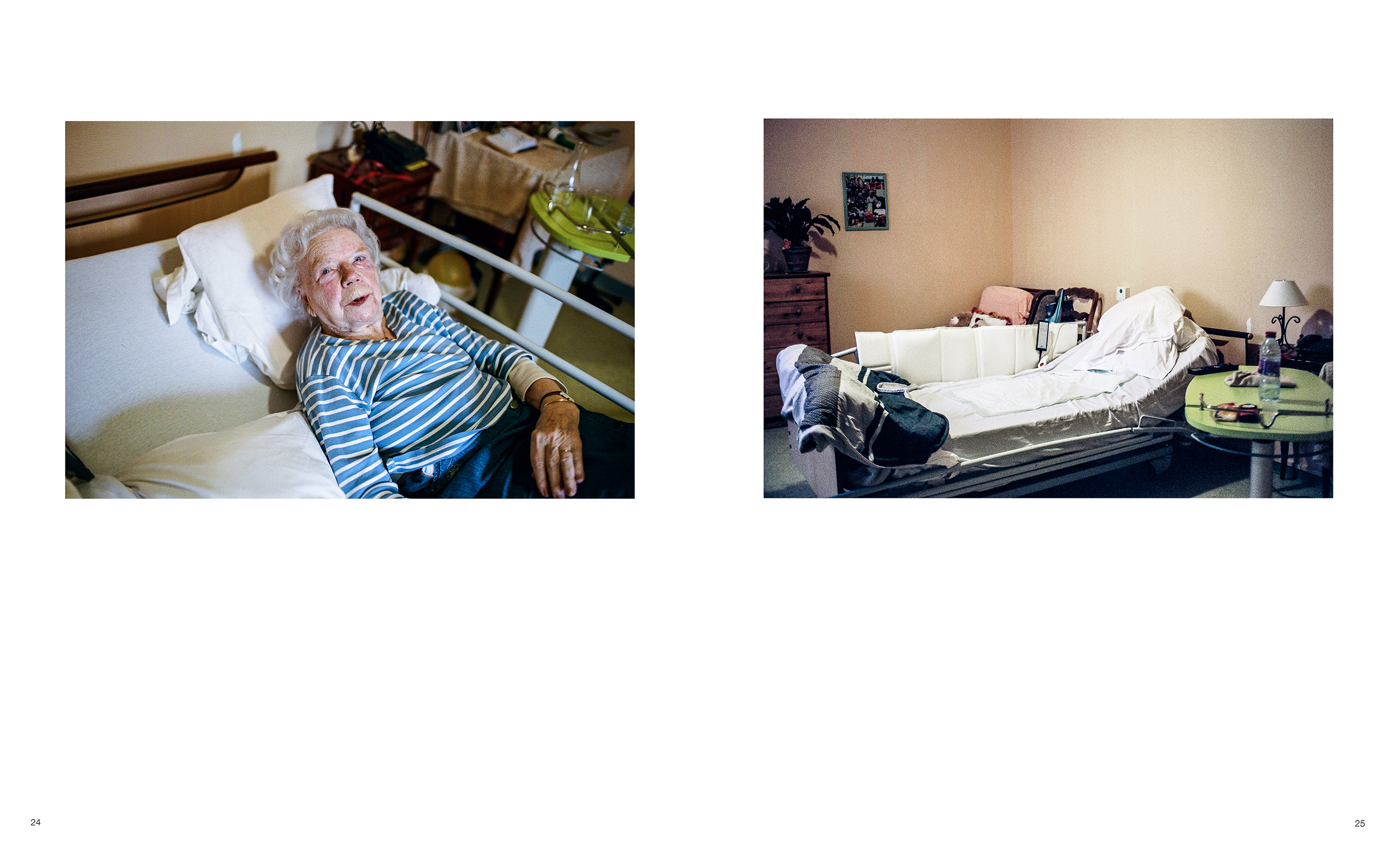 Cinq procédés photographiques, tous argentiques, se suivent pour rendre compte de l’évolution de leurs maladies. La matière se dégrade comme leurs cerveaux dysfonctionnent. Les images deviennent moins lisibles comme leurs perceptions de la réalité s’altèrent. L’émotion de leur disparition et le processus neurologique en cours sont transmis dans un même geste. En premier lieu, le grand-père de l’auteur est pris en photo dans unnoir et blanc charbonneux. Il est en EHPAD et bloqué dans le passé. Sa grand-mère essaie de le retenir de la chute dans des abymes de noirs profonds. Dans le même temps, Yann Castanier photographie sa grand-mère chez elle, seule, et les traces de son grand-père dans leur maison avec despellicules couleurs non-altérées. La colorimétrie est franche et fidèle.