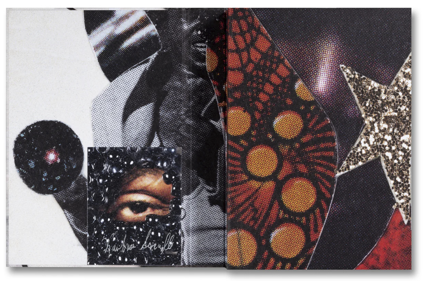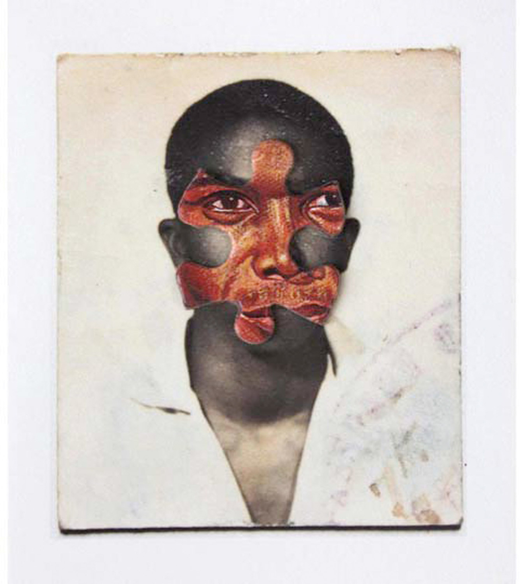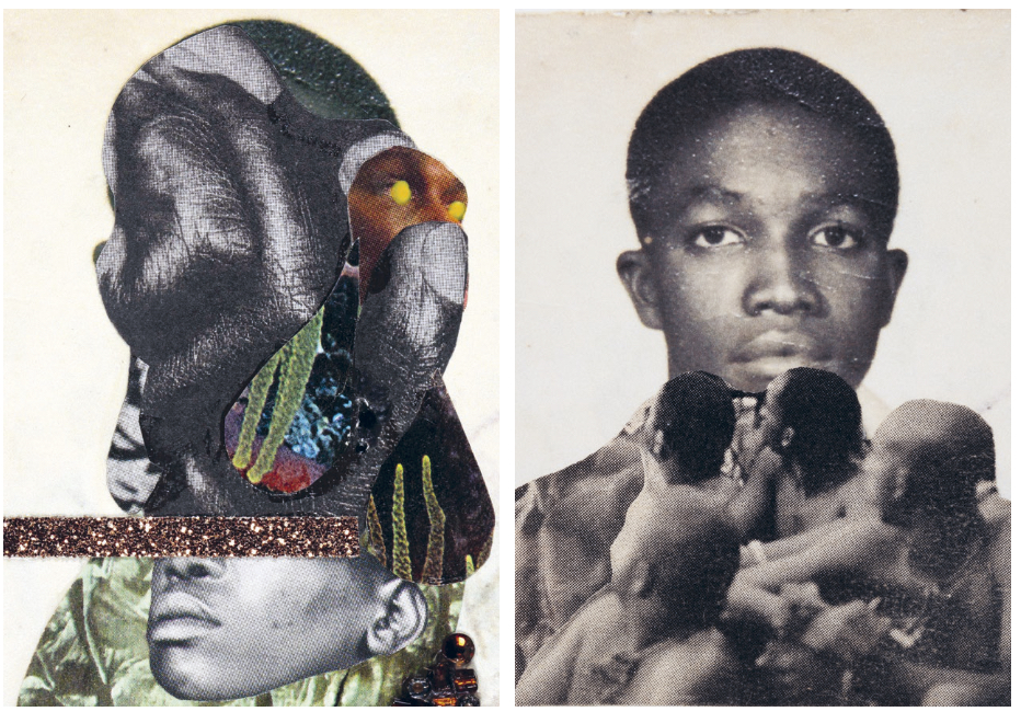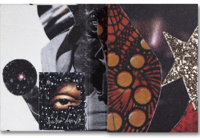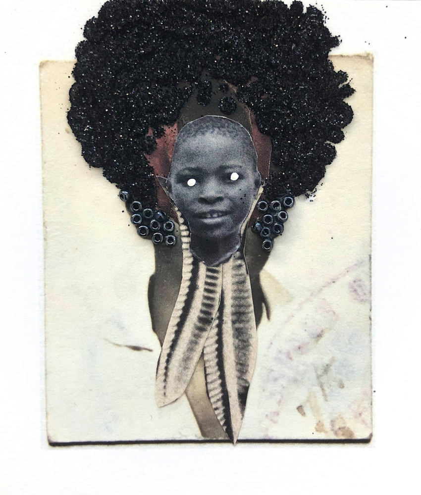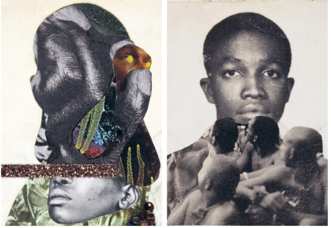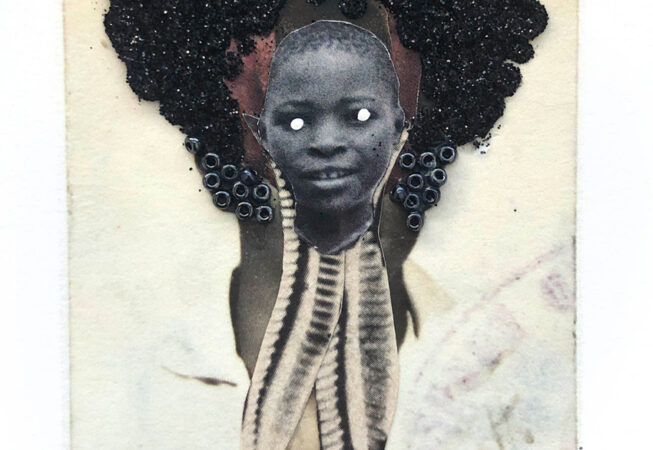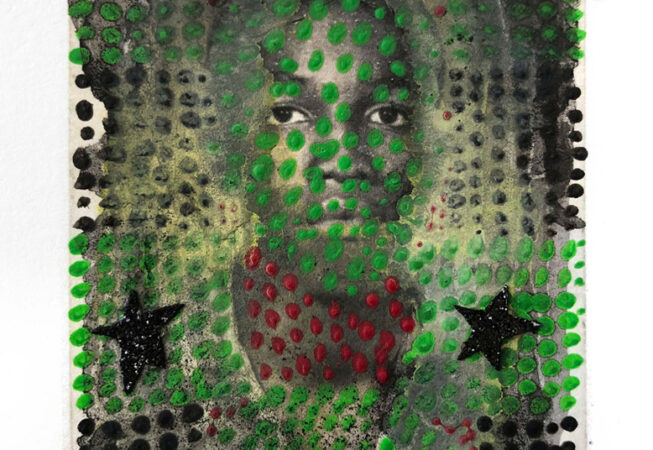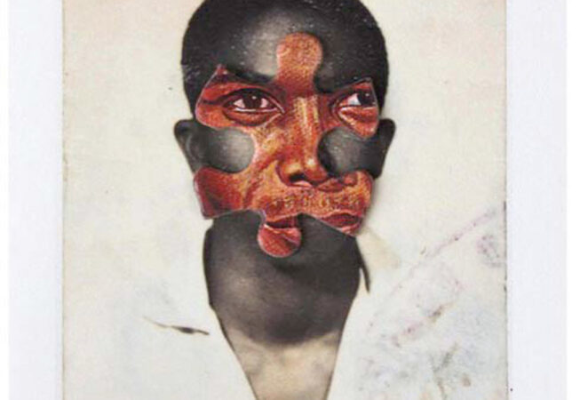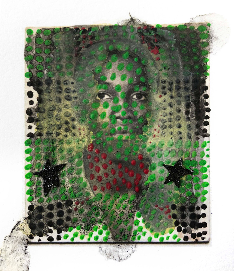 Passports 2012-2025 présente un corpus intime centré sur la photographie de passeport la plus ancienne du père de l’artiste. Keisha Scarville passeport diaspora réinterprète cette image plus de trois cents fois. Chaque itération intègre des matériaux variés : peintures, perles, fragments de photographies de corps noirs, feuille d’or et paillettes. Ces œuvres constituent ainsi un acte profondément texturé de photomontage.