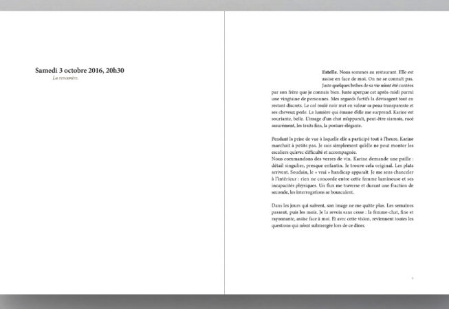 Souhaitant mieux comprendre la manière dont Karine vit le handicap au quotidien, Estelle Lagarde lui propose de poursuivre leurs échanges chez elle. Karine accepte. Commence alors un travail construit dans la durée, entre photographie, écriture, témoignages et amitié.