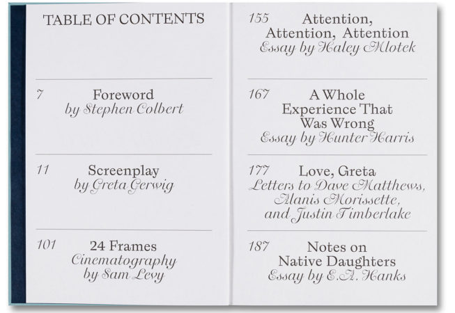 Le livre du scénario de Lady Bird de Greta Gerwig comprend un avant-propos de Stephen Colbert, des essais de Haley Mlotek, Hunter Harris et E. A. Hanks, ainsi que les lettres de Greta Gerwig à Dave Matthews, Alanis Morissette et Justin Timberlake.