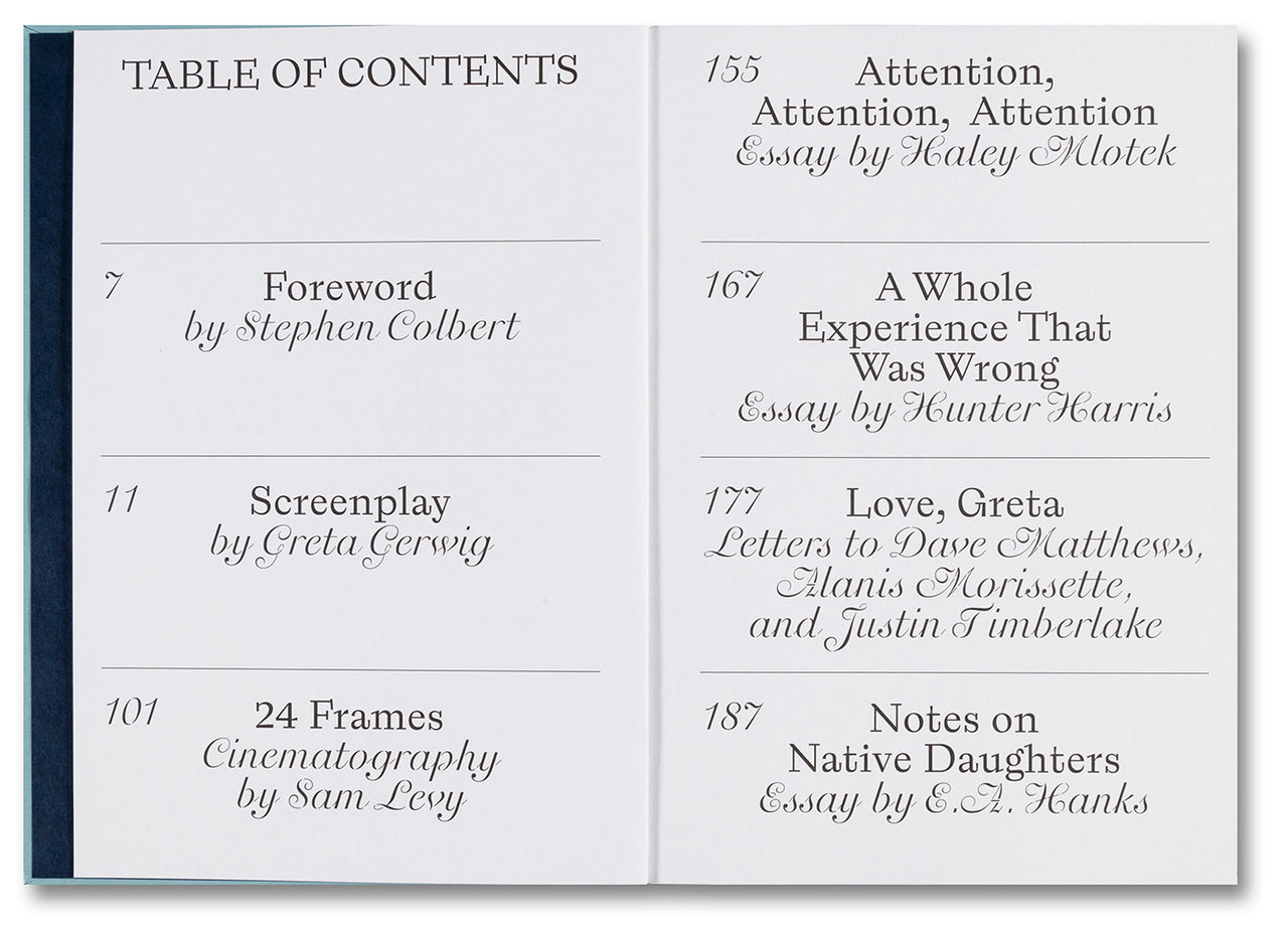 Le livre du scénario de Lady Bird de Greta Gerwig comprend un avant-propos de Stephen Colbert, des essais de Haley Mlotek, Hunter Harris et E. A. Hanks, ainsi que les lettres de Greta Gerwig à Dave Matthews, Alanis Morissette et Justin Timberlake.