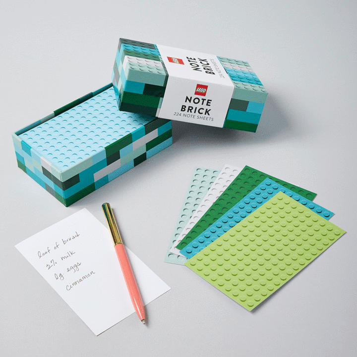 - La boîte contient 224 notes en couleur, chacune avec un motif de briques LEGO d’un côté.