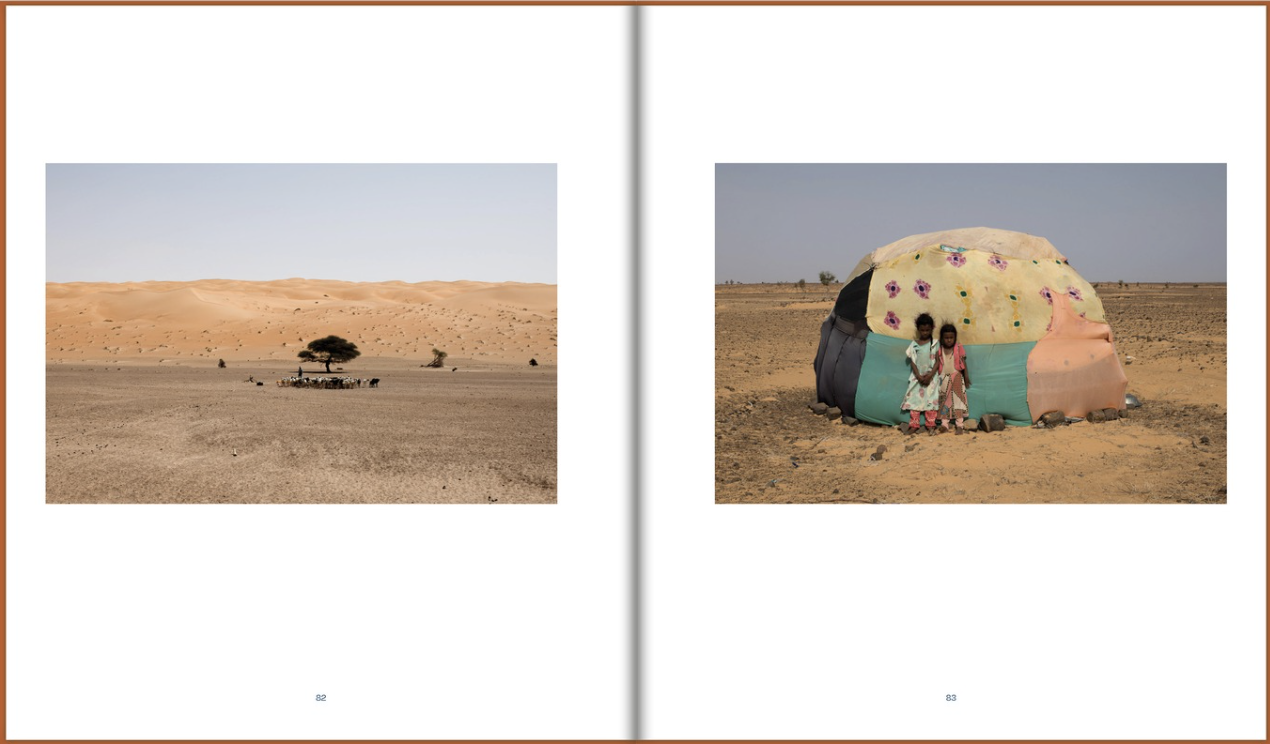 Introduit par une préface de l’écrivain mauritanien Mbarek Ould Beyrouk, le livre est rythmé en six chapitres ponctués de poèmes de l’autrice franco-mauritanienne Mariem Derwich traduits en arabe. La langue de la poétesse, imagée et mélodieuse, accompagne magnifiquement la beauté des images comme un murmure au milieu de ce silence infini.