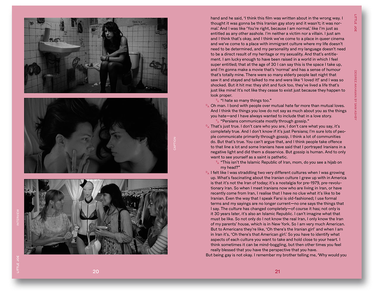 Cette publication difficile à trouver et à tirage limité s’obstine à n’être imprimée qu’une seule fois, privilégiant le bouche-à-oreille et la méthode de la main à la main par laquelle bon nombre des films qu’elle célèbre auraient circulé en premier lieu. Elle rejette l’approche habituelle qui consiste à passer en revue les nouvelles sorties en faveur de l’exploration de films qui demandent à être réévalués, célébrant tout ce qui mérite d’être débattu par la critique, des obscurs films d’art au porno en passant par les classiques hollywoodiens. Chaque numéro propose des essais, des conversations approfondies, des nouvelles, des bandes dessinées, des œuvres d’art commandées et des découvertes d’archives d’un grand nombre d’écrivains, d’artistes, de cinéastes et d’universitaires queers et alliés.