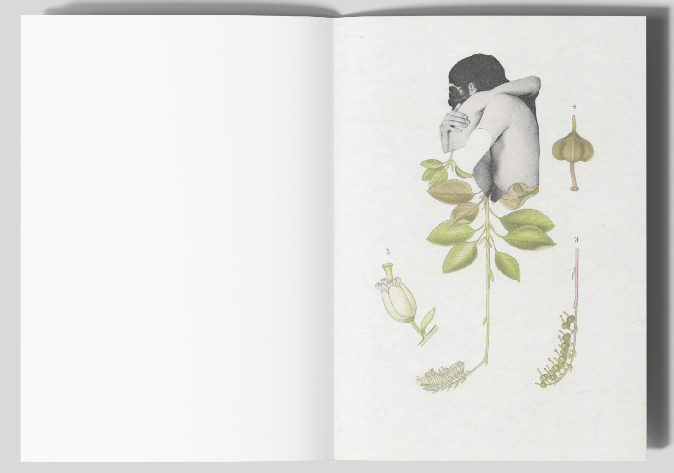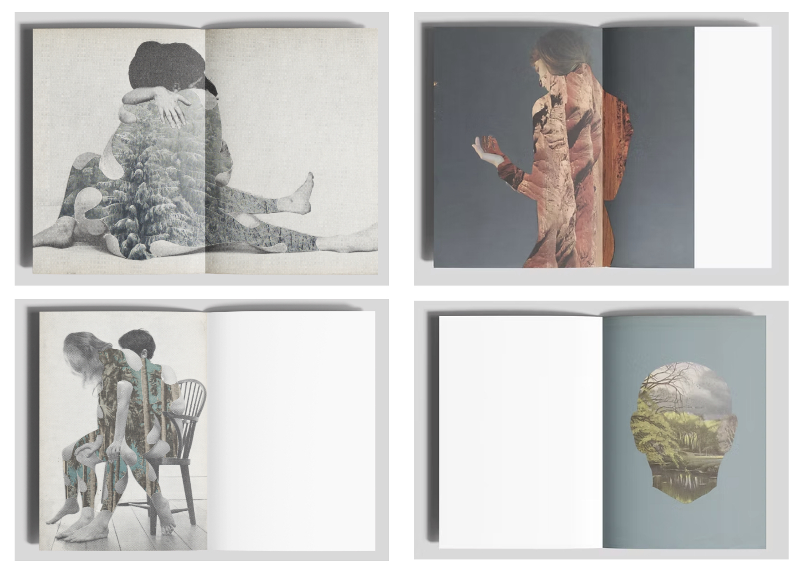 Ensomheden Vi Deler signifie en danois « La solitude que nous partageons ». C’est une méditation sur la fragilité des architectures humaines et les formes cachées du lien entre les êtres. Ainsi, 35 collages présentent deux amants dont les corps sont composés de motifs végétaux et naturels. Ils s’enlacent, se chevauchent, avec une sensualité douce et enveloppante. Par ailleurs, l’objet lui-même est soigné : reliure suisse, tranche verte fluo pantone, papier Freelife Vellum 120g. C’est donc bien plus qu’un livre — c’est une expérience tactile et visuelle.