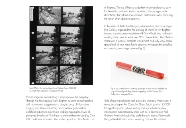 Cette édition comprend, tout d’abord, une sélection d’images de la série iconique The Last Resort. Elle intègre également des archives inédites — photographies, planches-contacts et ephemera tirés de la collection personnelle de Martin Parr. Isaac Blease, archiviste de la Foundation, explore notamment le contexte du projet et les influences qui ont conduit Parr à passer du noir et blanc à la couleur. Peter Brawne, concepteur du livre original de 1986, revient, de plus, sur le processus de design. Enfin, Susie Parr, épouse de Martin, livre un texte court sur New Brighton et sur la première exposition du travail à l’Open Eye Gallery de Liverpool en 1985.