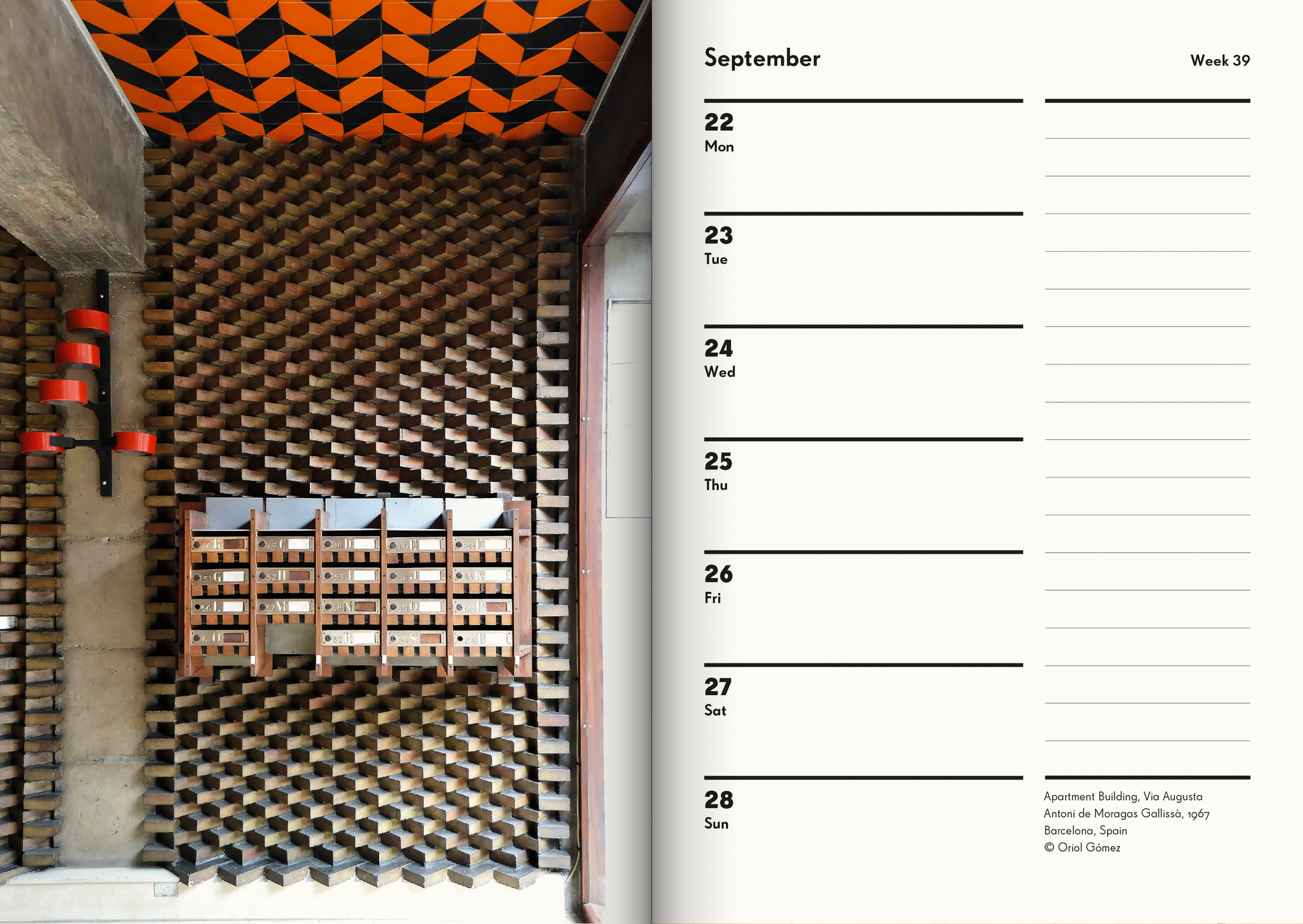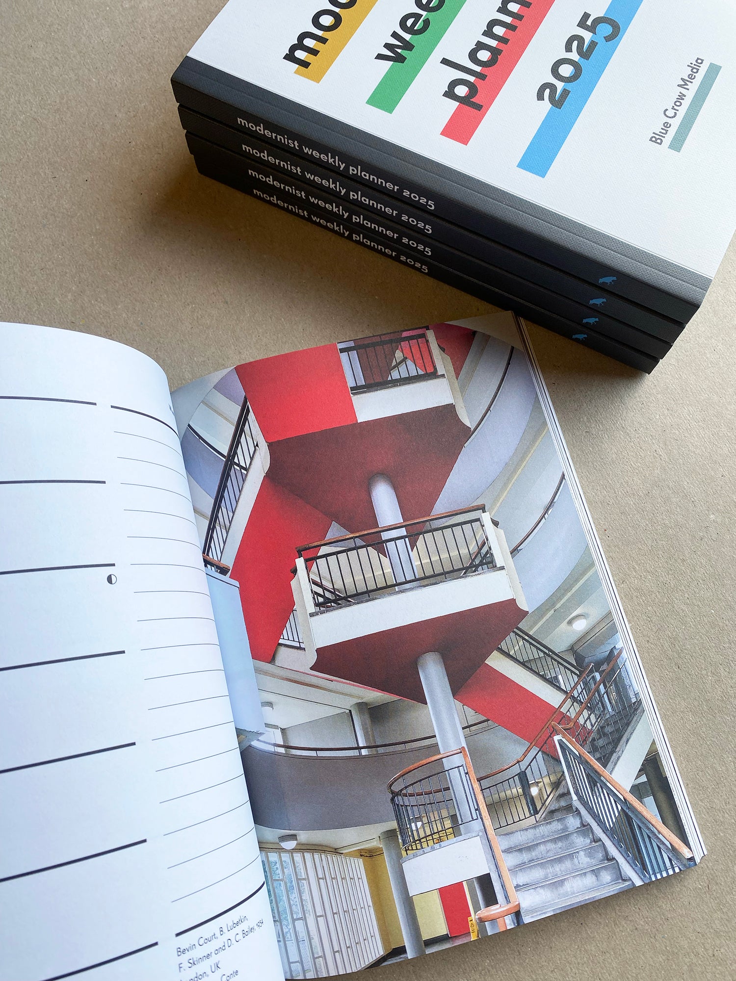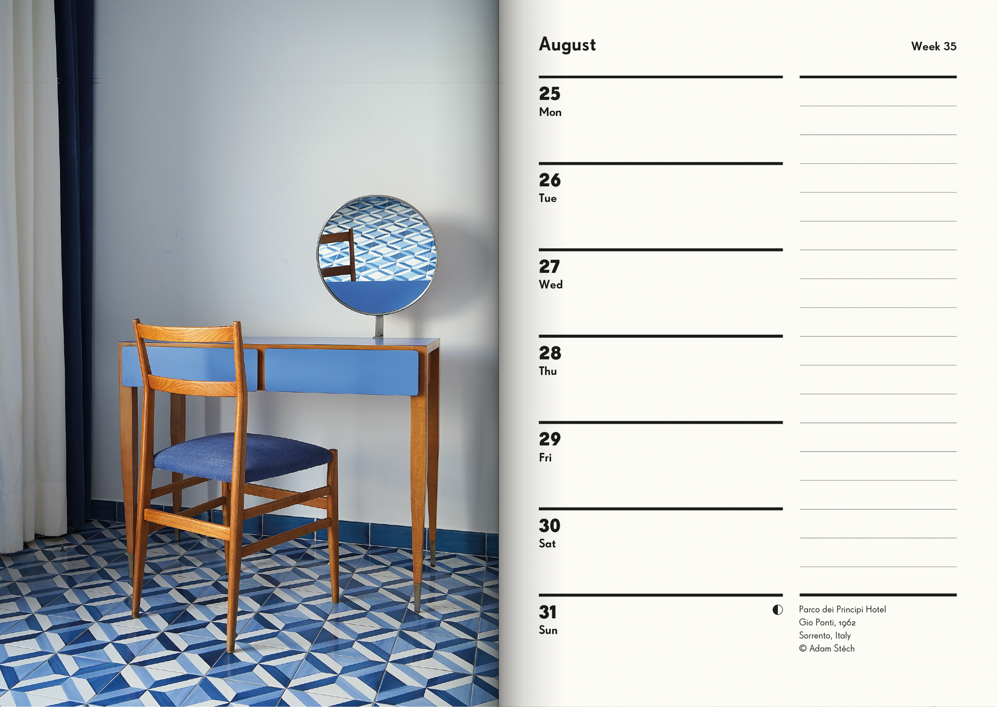 Notre semainier 2025 en édition limitée célèbre les intérieurs modernistes à travers l’Europe. Avec des photographies d’intérieurs emblématiques et moins connus prises par certains des plus grands photographes d’architecture d’aujourd’hui, ce semainier unique et élégant allie la fonction et la forme. L’agenda est cousu à plat et imprimé en lithographie sur du papier soigneusement sélectionné par l’un des imprimeurs européens les plus respectueux de l’environnement. Conçu pour une utilisation quotidienne et une possession à long terme.