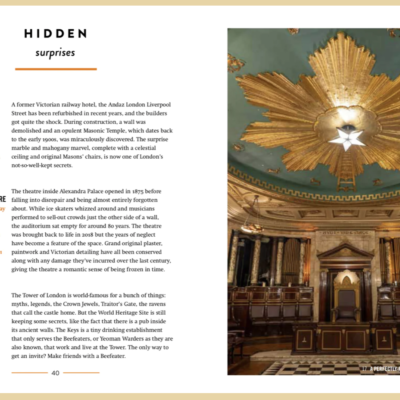 L’auteur Ellie Walker-Arnott vous aidera à voir Londres sous un nouveau jour et à découvrir des sites et des détails que vous n’aviez jamais cherchés auparavant, comme une sandwicherie familiale qui existe depuis les années 1900, une salle de bingo installée dans un ancien cinéma aux arches gothiques, et une boutique traditionnelle de pies & mash qui se transforme en un bar à cocktails animé la nuit.