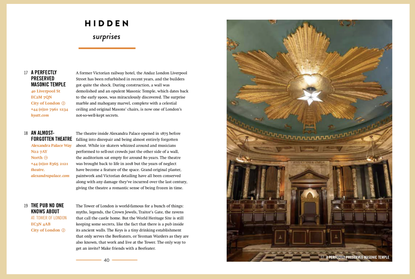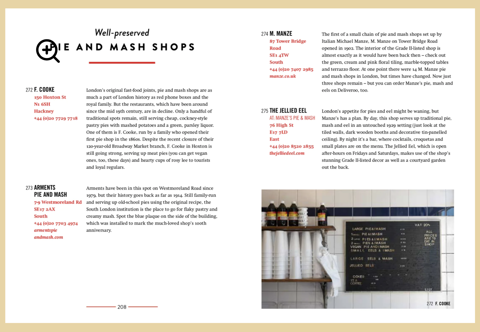 L’auteur Ellie Walker-Arnott vous aidera à voir Londres sous un nouveau jour et à découvrir des sites et des détails que vous n’aviez jamais cherchés auparavant, comme une sandwicherie familiale qui existe depuis les années 1900, une salle de bingo installée dans un ancien cinéma aux arches gothiques, et une boutique traditionnelle de pies & mash qui se transforme en un bar à cocktails animé la nuit.