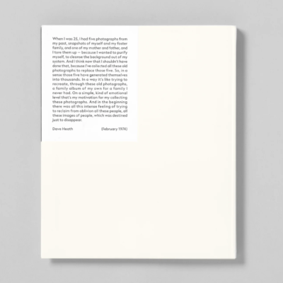 En parlant de sa collection de photographies vernaculaires Heath dit « Quand j’avais 25 ans, j’avais cinq photos de mon passé, des photos de moi-même et de ma famille d’accueil, ainsi que de l’un de mes parents, et je les ai déchirées – parce que je voulais me purifier, nettoyer l’arrière-plan de mon système. Et je pense maintenant que je n’aurais pas dû faire ça, parce que j’ai rassemblé toutes ces vieilles photos pour remplacer ces cinq. Donc, dans un sens, les chaussures cinq se sont produites en milliers. D’une certaine façon, c’est comme essayer de recréer, à travers ces vieilles photos, un album familial pour une famille que je n’ai jamais eu. D’un niveau émotionnel simple, c’est ma motivation pour collecter ces photos. Et au début, il y avait tout ce sentiment intense d’essayer de récupérer de l’oubli tous ces gens, toutes ces images de personnes, qui étaient destinées à disparaître. – Dave Health