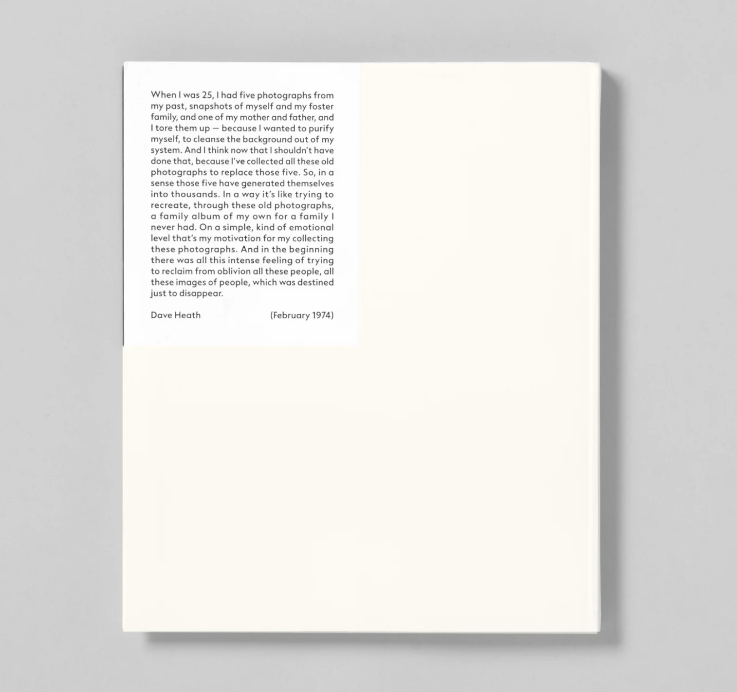 En parlant de sa collection de photographies vernaculaires Heath dit « Quand j’avais 25 ans, j’avais cinq photos de mon passé, des photos de moi-même et de ma famille d’accueil, ainsi que de l’un de mes parents, et je les ai déchirées – parce que je voulais me purifier, nettoyer l’arrière-plan de mon système. Et je pense maintenant que je n’aurais pas dû faire ça, parce que j’ai rassemblé toutes ces vieilles photos pour remplacer ces cinq. Donc, dans un sens, les chaussures cinq se sont produites en milliers. D’une certaine façon, c’est comme essayer de recréer, à travers ces vieilles photos, un album familial pour une famille que je n’ai jamais eu. D’un niveau émotionnel simple, c’est ma motivation pour collecter ces photos. Et au début, il y avait tout ce sentiment intense d’essayer de récupérer de l’oubli tous ces gens, toutes ces images de personnes, qui étaient destinées à disparaître. – Dave Health