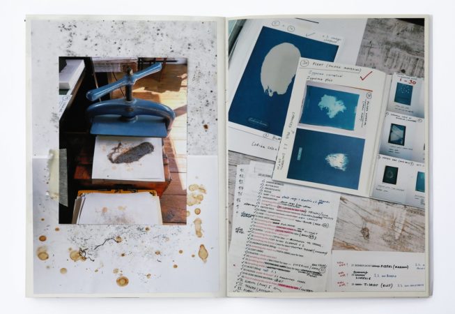 Pour coïncider avec le 180e anniversaire du livre d’Atkin, Barker a minutieusement créé une réplique de la publication originale avec 202 illustrations, chaque spécimen botanique étant remplacé par des vêtements ou des fibres trouvés. La publication Photographs of British Algae : Cyanotype Imperfections est une version soigneusement éditée de ce projet de réplique qui commence par des vêtements extérieurs, tels qu’un manteau imperméable ou une parka, et se termine par des sous-vêtements portés au plus près de la peau.