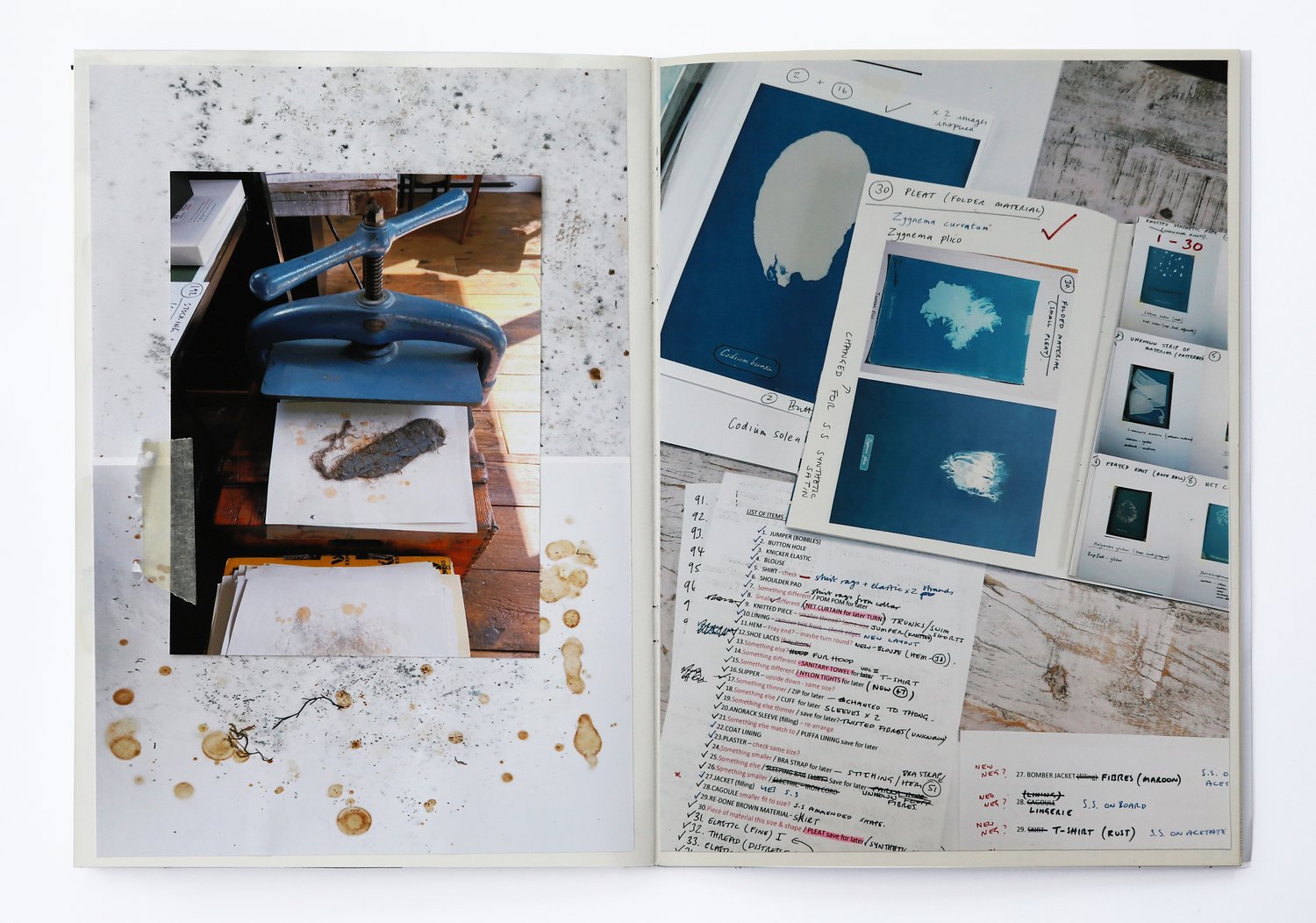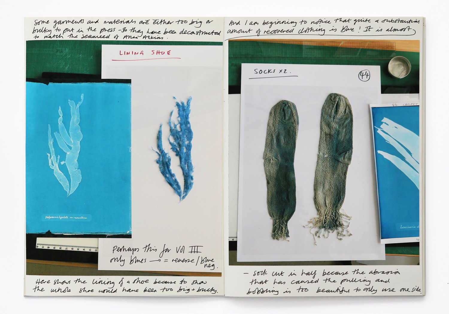 Pour coïncider avec le 180e anniversaire du livre d’Atkin, Barker a minutieusement créé une réplique de la publication originale avec 202 illustrations, chaque spécimen botanique étant remplacé par des vêtements ou des fibres trouvés. La publication Photographs of British Algae : Cyanotype Imperfections est une version soigneusement éditée de ce projet de réplique qui commence par des vêtements extérieurs, tels qu’un manteau imperméable ou une parka, et se termine par des sous-vêtements portés au plus près de la peau.