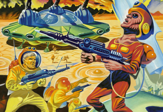 Rayguns and Rocketships! Des dames en combinaison spatiale prises dans les tentacules d’extraterrestres insectoïdes maléfiques! Qui pourrait résister à de telles merveilles ? Les livres de poche de science-fiction ont explosé dans le paysage littéraire des années 40 et 50 avec la force d’une bombe gamma extraterrestre. Des titres tels que Rodent Mutation!, Beyond the Galaxy, Dawn of the Mutants et Mushroom Men from Mars sont apparus chez des éditeurs éphémères profitant de la fin du rationnement du papier d’après-guerre.