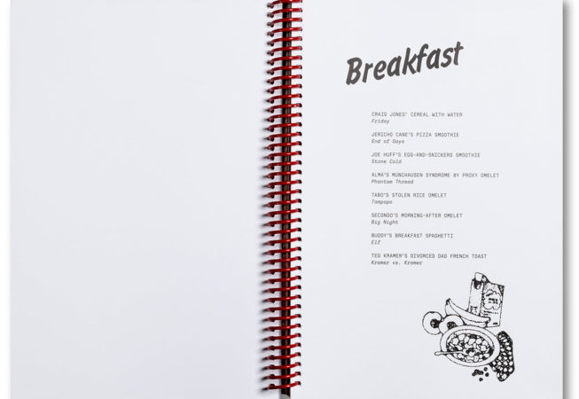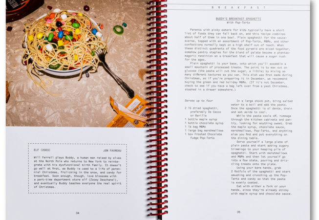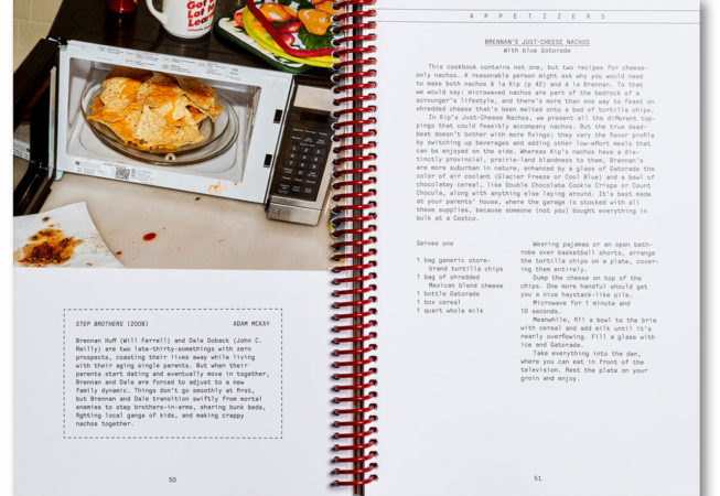Suivi d’une préface du célèbre chef Matty Matheson, le livre divise ses 54 recettes en chapitre comprenant : boissons, petit-déjeuner, entrées et collations, sandwichs, dîner et dessert. Laissez-vous tenter (avec prudence) par les céréales à l’eau du vendredi de Craig Jones ou les spaghettis du petit-déjeuner de Buddy the Elf pour commencer, suivis du célèbre repas de Thanksgiving au micro-ondes de Lady Bird , ou des hot-dogs de nuit de Zorg de Betty Blue .