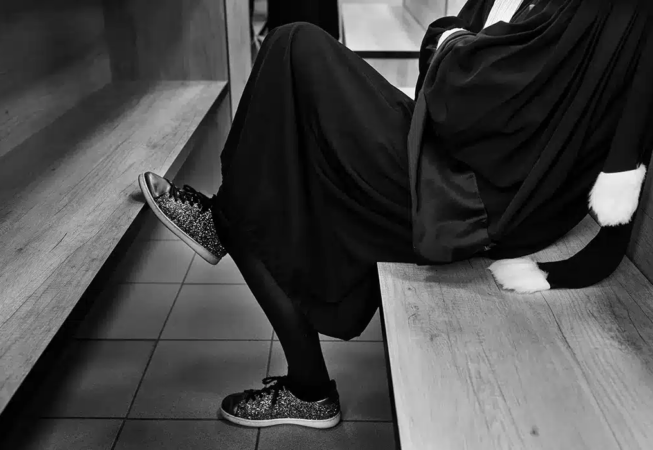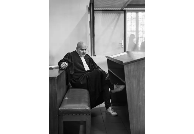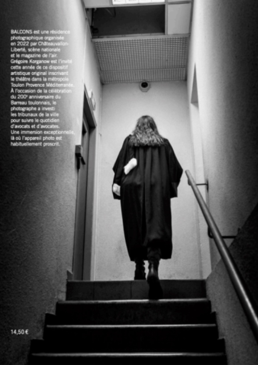 Depuis deux ans, Châteauvallon-Liberté, scène nationale de Toulon Provence Méditerranée en collaboration avec le magazine de l’air, organise Balcons, une résidence photographique. Cette année Grégoire Korganow a porté son regard sur la robe noire pour nous donner à voir autrement la justice. Ce photographe, qui mène depuis de longues années un magistral travail sur les centres de détention s’est en effet focalisé sur le travail des avocats. En novembre et en décembre 2022, il a investi les tribunaux de Toulon pour réaliser une série inédite sur celles et ceux qui ont prêté serment de défendre, qui que ce soit. Il a pu assister librement à des audiences où l’appareil photo est ordinairement proscrit.