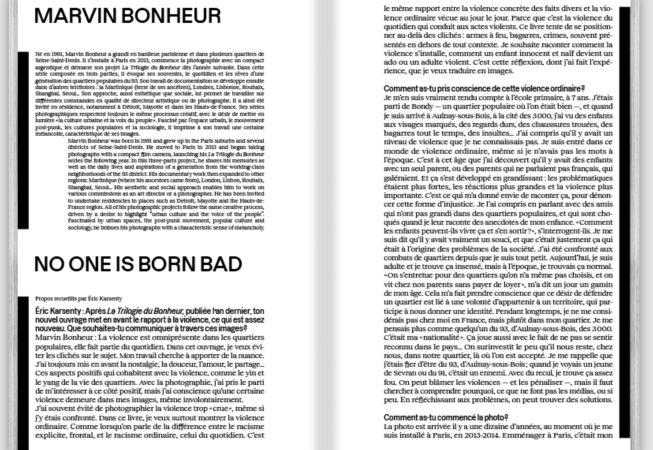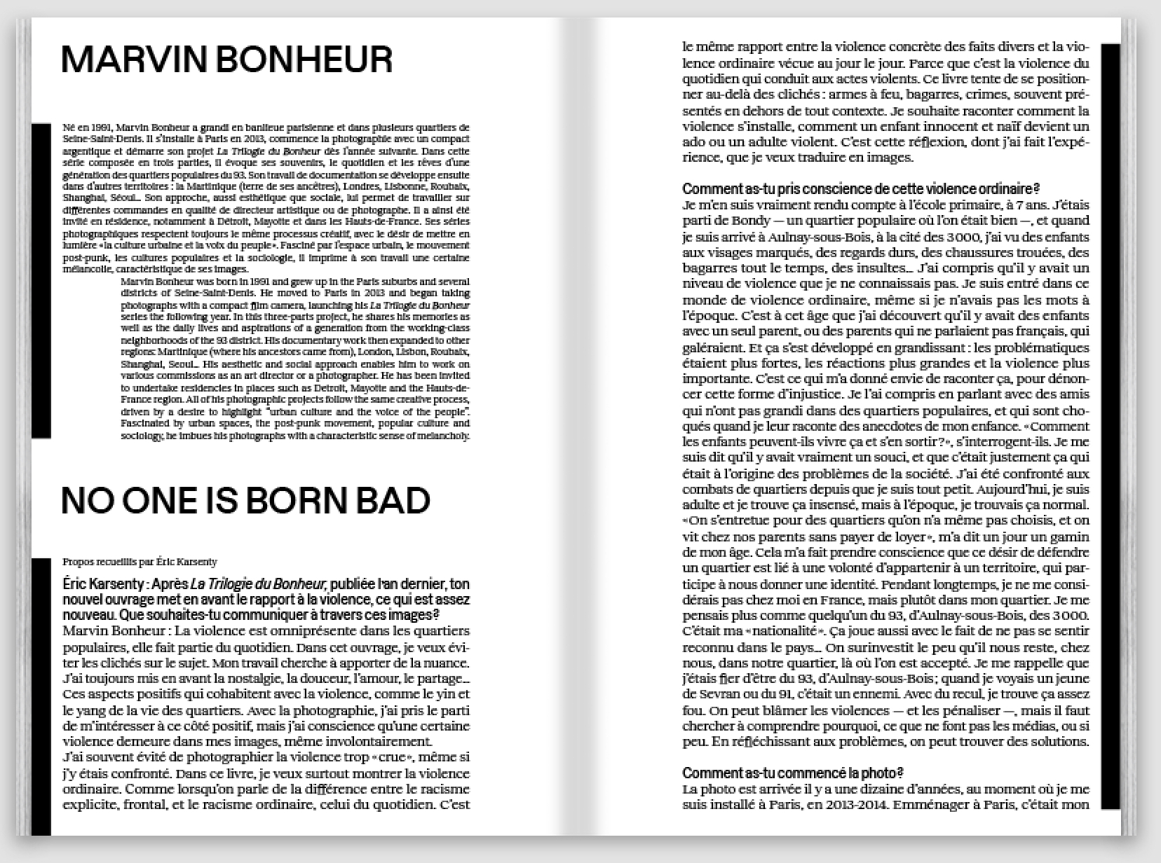 Né en 1991, Marvin Bonheur grandit en banlieue parisienne, au sein de la Seine-Saint-Denis. Installé à Paris depuis 2013, il découvre la photographie avec un compact argentique et développe rapidement La Trilogie du Bonheur, une série emblématique consacrée aux souvenirs, au quotidien et aux rêves des quartiers populaires du 93.