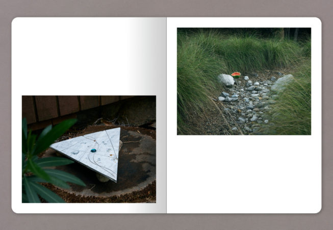 Ce sont les yeux rouges d’un portail de garage, un arbre tordu poussant sur des lits de graviers disparates, des caddies abandonnés, une étrange décoration triangulaire, comme un semblant de carte imaginaire qu’il est impossible de lire. Ce sont les signes à déchiffrer d’une zone résidentielle délibérément vidée, dont la présence humaine reste insaisissable, mais dont on reconnaît les marqueurs inévitables : les surfaces en stuc et en asphalte, les clôtures et les carrosseries en grillage, les éclats de verdure aussi.