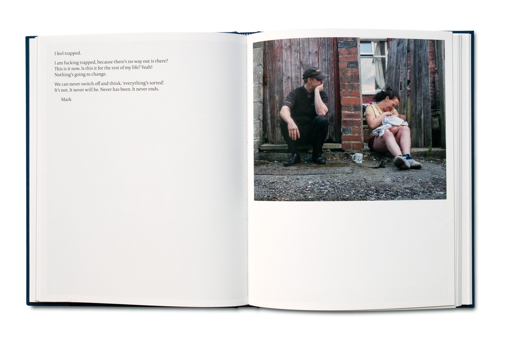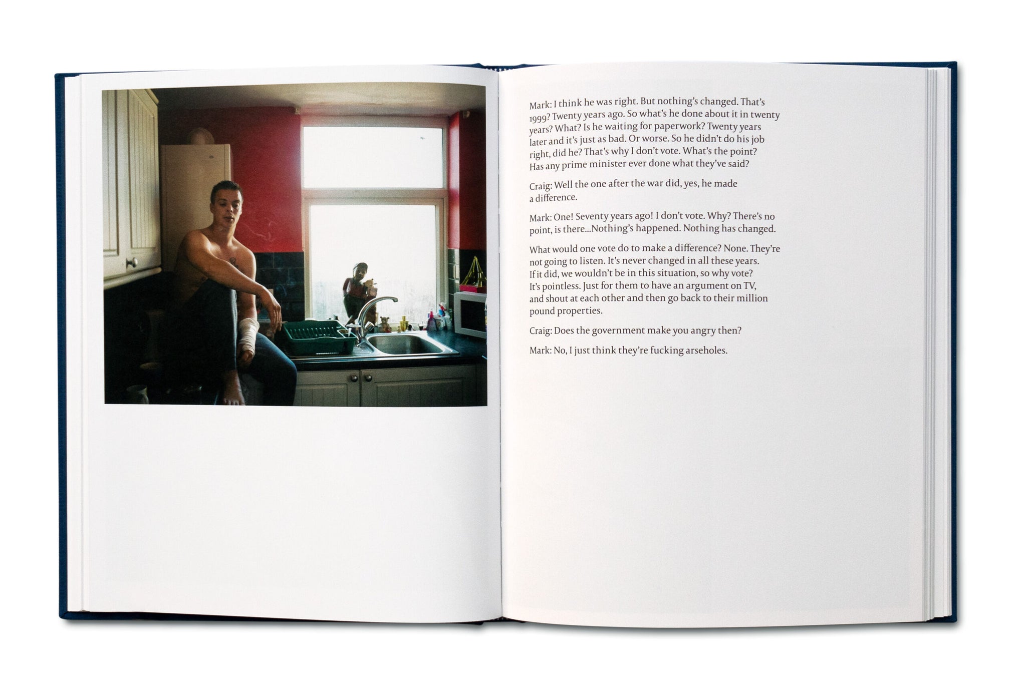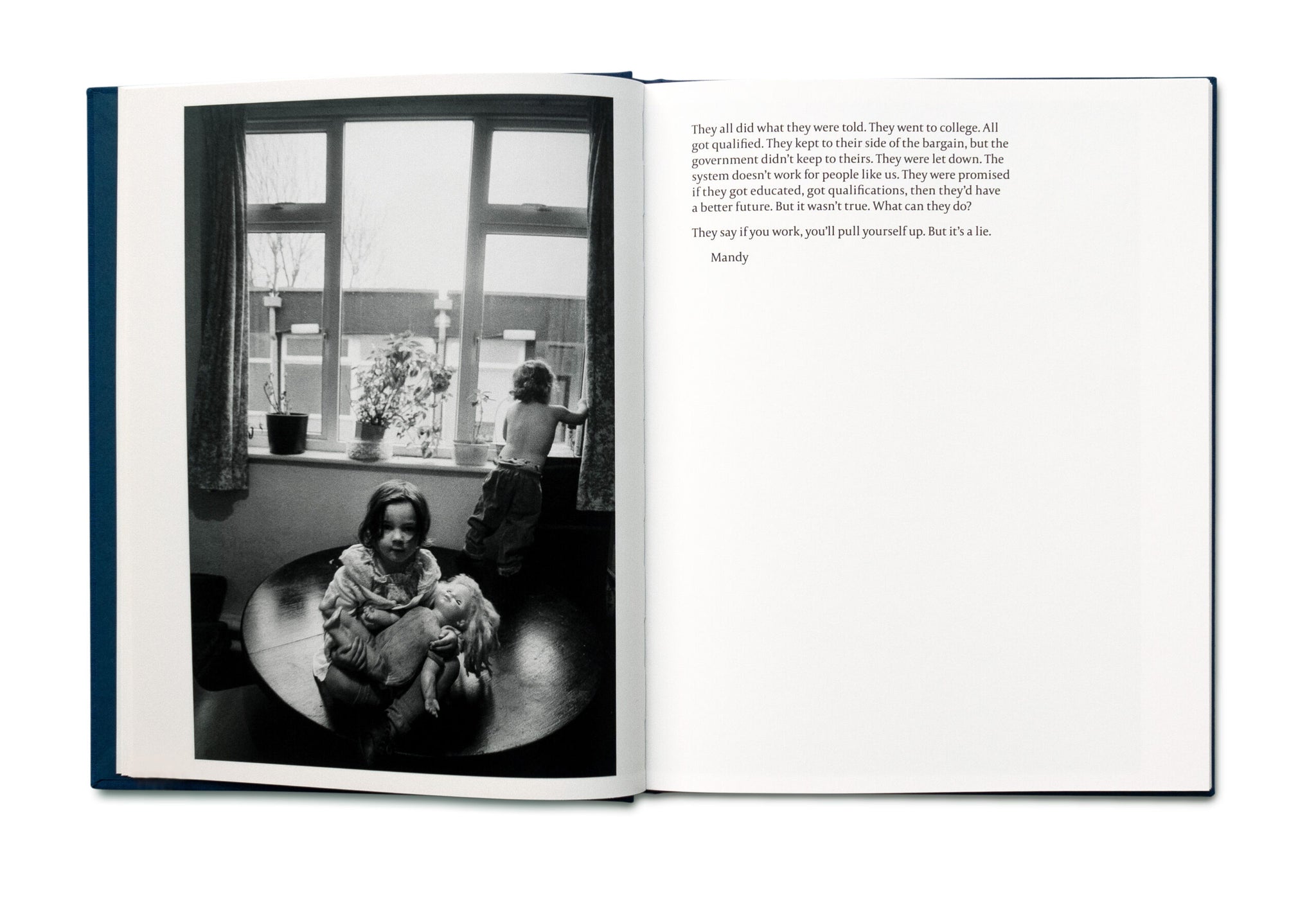 Thatcher’s Children, un projet à long terme du photographe Craig Easton, examine la nature intergénérationnelle de la pauvreté telle qu’elle est vécue par trois générations de la famille Williams dans le nord de l’Angleterre. Le passage du temps montré dans le livre démontre comment la privation est liée aux échecs des politiques sociales des gouvernements successifs.