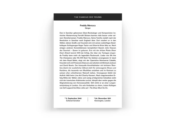 Chaque jour de l’année, le calendrier détachable raconte l’histoire inspirante d’une icône morte trop tôt. Qu’il s’agisse de James Dean, de Jeanne d’Arc ou de Friedrich Schiller, la disparition soudaine de ces héros choque la postérité. Les protagonistes sont des pionniers dans leur domaine, de véritables génies, des inventeurs courageux, des stars célèbres, des héros déchus, des combattants courageux, des penseurs démunis, des athlètes extraordinaires et des talents musicaux exceptionnels. Un groupe illustre de véritables légendes qui accomplissent de grandes choses à un jeune âge et repoussent les limites de leur époque.