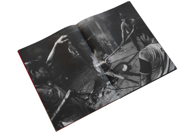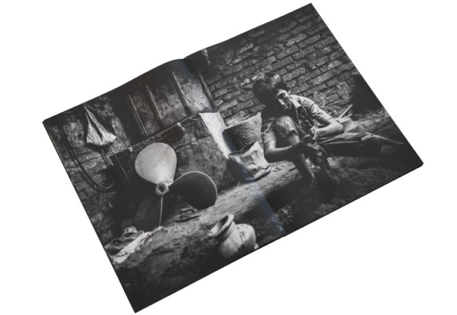 Des flammes brûlantes, une fumée noire qui monte, des perles de sueur qui coulent sur des visages couverts de suie, des voix d’hommes en colère qui résonnent dans l’air, et l’odeur du mazout. Depuis ma première visite au Bangladesh en 2012, j’ai visité et photographié à plu-sieurs reprises les personnes qui fabriquent les « vis » des navires. Ils travaillaient dans un petit atelier sombre, semblable à une grotte.