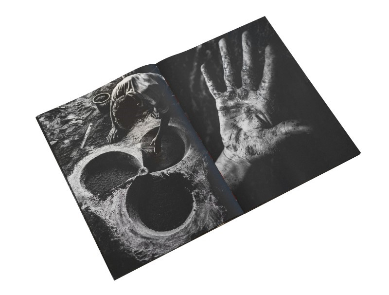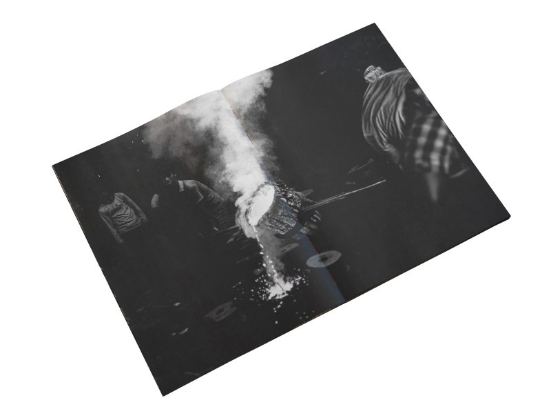 Là, adultes et enfants travaillaient ensemble pour créer un métal froid et dur en versant un liquide rouge en fusion, comme du magma, dans le sol noir, qui était recouvert de sable de fer. On se croirait dans le monde des mythes de la création. L’immobilité et le mouvement, la douceur et la dureté, la lumière et l’ombre, la régénération et la destruction.