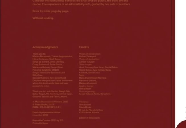 Le livre This Mortal House Building 1 de Maria Stamenković Herranz, édité par Palais Books, cherche à traduire sous une forme éditoriale la performance de l’artiste au Sakıp Sabancı Museum, Istanbul. Durant 24 jours MSH a construit, dans l’espace du musée, un labyrinthe de briques les yeux bandés, puis le dernier jour l’a détruit. À partir des nombreuses photographies qui constituent la documentation de la performance, le livre propose une lecture non linéaire, elle même sujette à des constructions et déconstructions.