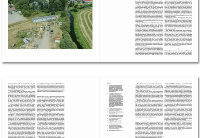 Tout en explorant les possibilités formelles de la photographie aérienne, Topographies témoigne également d’un glorieux dévouement au détail et à la surprise, dans lequel la moindre courbe d’une rivière ou le moindre virage d’une ombre révèle les textures et les couleurs des paysages urbains et suburbains de l’Amérique, le tout étudié avec la rigueur caractéristique de Shore.