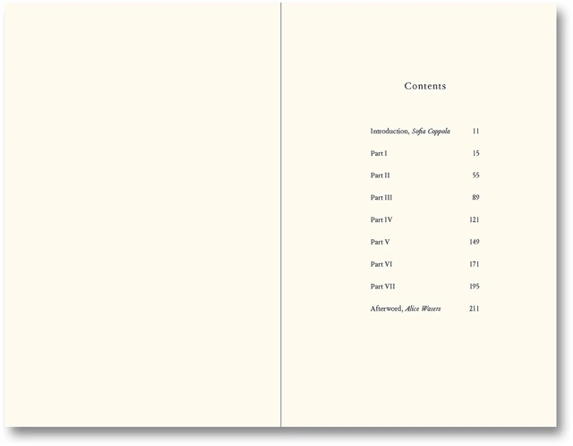 L’ouvrage comprend une introduction de Sofia Coppola et un afterword d’Alice Waters. Il est édité par Davia Nelson et Vendela Vida, avec une conception graphique de Bryan Cipolla.