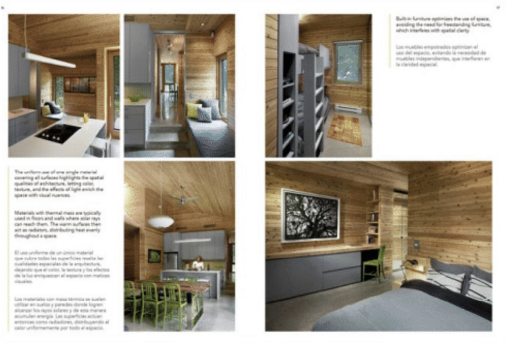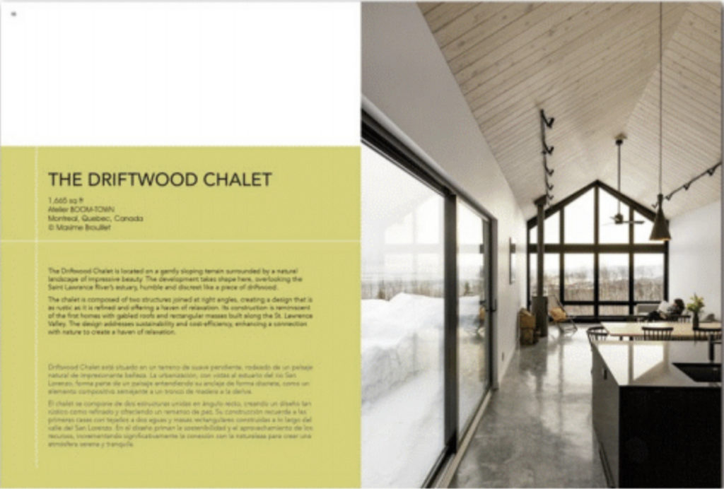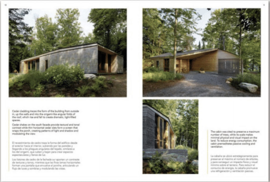 Le verre et le bois occupent une place centrale en tant que matériaux prédominants utilisés à l’intérieur et à l’extérieur. La fenestration généreuse ouvre les espaces intérieurs à la lumière du jour et aux vues. Les principes de durabilité et les conceptions qu’ils génèrent évoluent pour refléter l’utilisation de matériaux et de technologies intrinsèquement liés à un lieu et à une époque. De tels principes étaient déjà implantés dans l’architecture vernaculaire grâce à la prise en compte de facteurs géographiques, topographiques, ainsi que culturels et historiques.